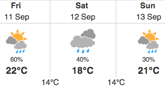 Up to 50,000 music lovers are expected over three days, if the sun is shining. Rain is predicted all weekend, according to Environment Canada (screenshot below).