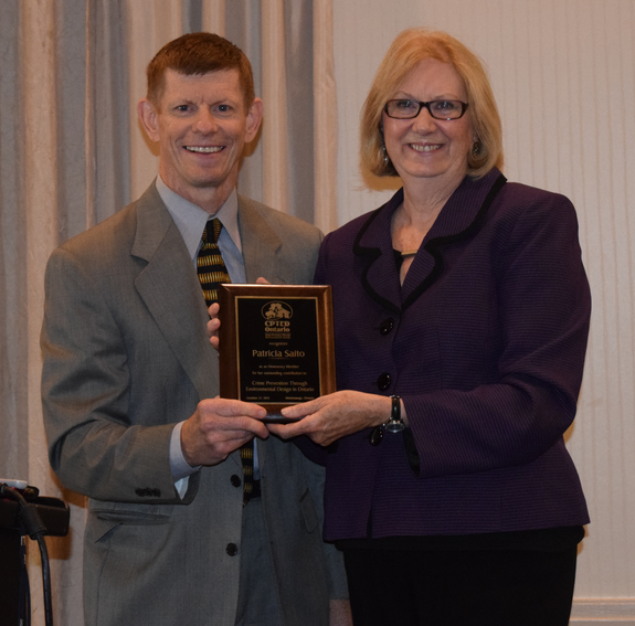 (Crime Prevention Through Environmental Design president Const. Tom McKay presents Ward 9 Coun. Pat Saito with an award on Oct. 27, 2015. Photo: City of Mississauga).