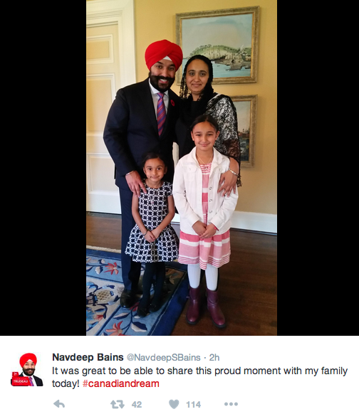 Bains, 38, the Mississauga-Malton Member of Parliament, also received the Great Seal of Canada from Governor General David Johnston, tweeting he is “honoured to serve as the Registrar General of Canada.”