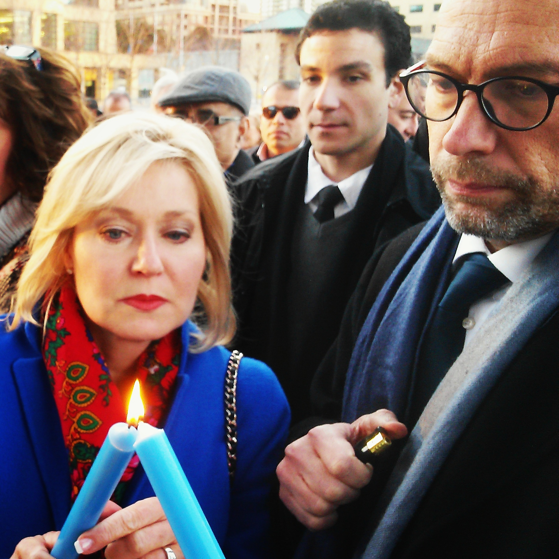 Blue, white, and red taper candles were lit by politicians as the modest crowd looked on and the French national anthem played.