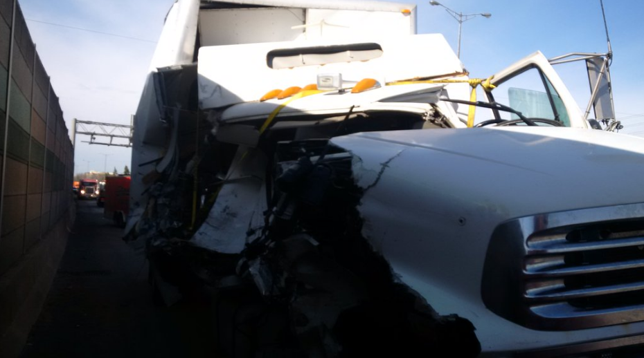 The truck rear-ended a provincial Ministry of Transportation maintenance vehicle in the right eastbound lane at Cawthra Rd. at 3:15 a.m., said OPP.