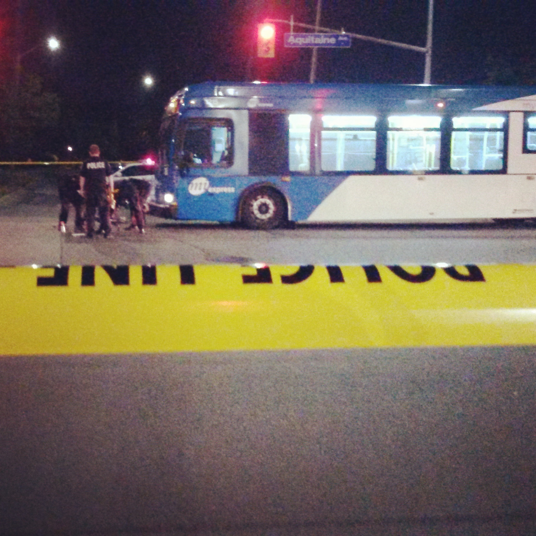 Officers on scene – between the old Blockbuster Video and Beer Store plazas – were examining a royal blue men’s bike in front of a westbound MiWay bus on Aquitaine Ave.