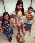 Grade 3 students Alessia Fusca, Isabella Vicente, and Olivia Trigiani demonstrate a house of cards they built during science class using recycled materials. “I learned that it’s good to have a strong base,” said Vicente. (Photo: Kelly Roche/QEW South Post)