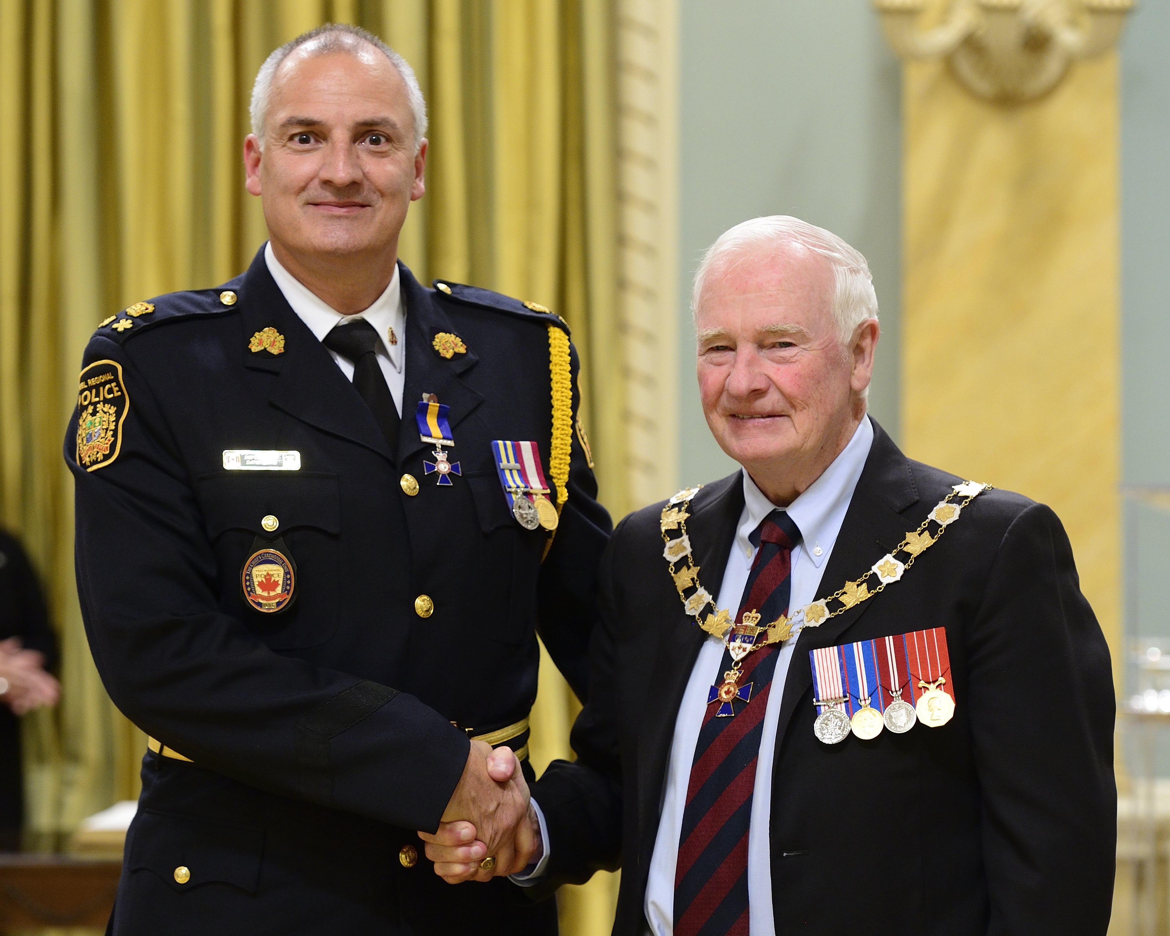 Deputy Chief David Jarvis and Staff Supt. Randy Patrick were invested as Members of the Order of Merit of the Police Forces by Governor General David Johnston, recognizing their significant contributions to policing in Canada.